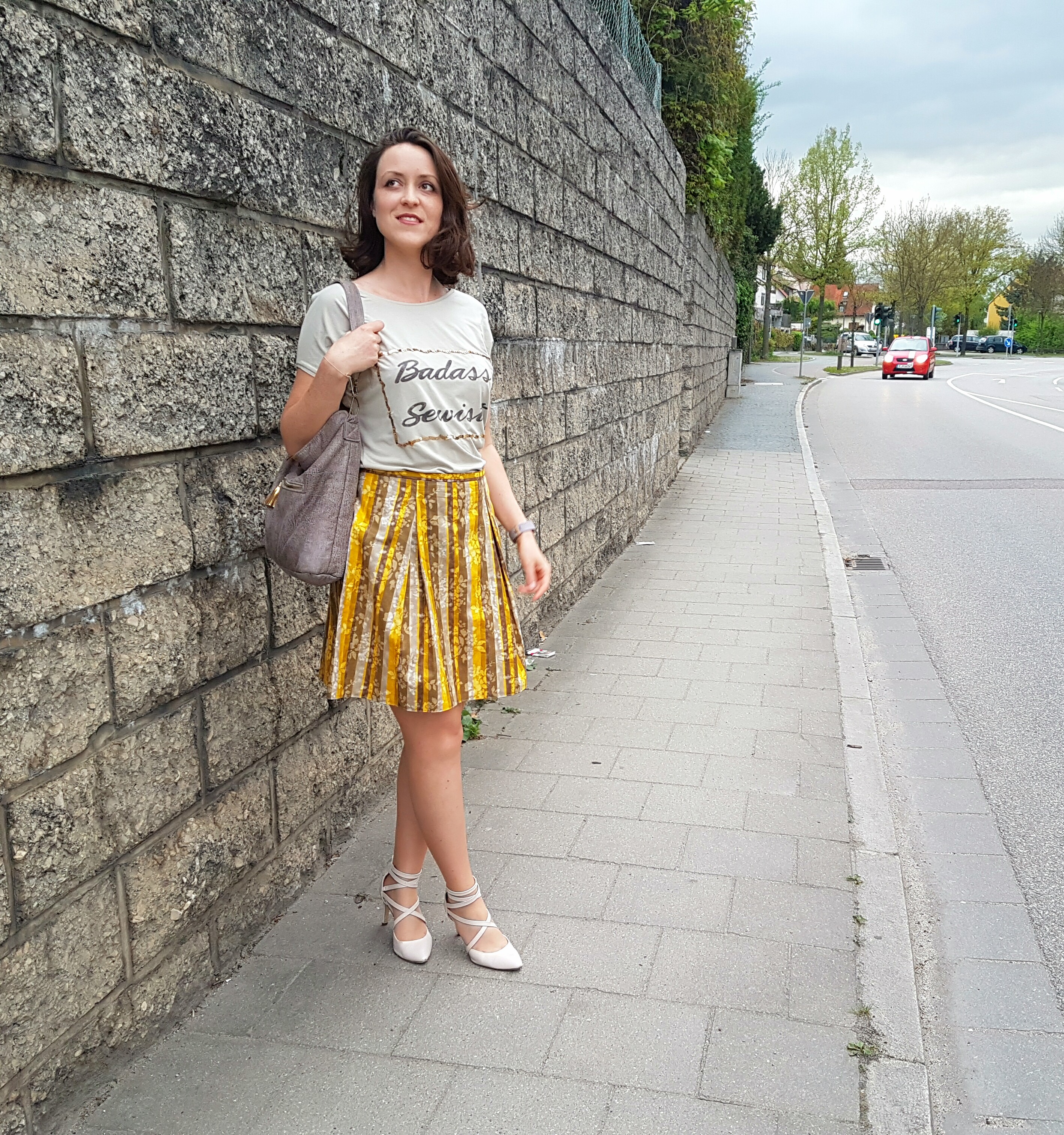 Aber dafür ist das Shirt wie für den gelb-gestreiften Rock geschaffen, den ich “Sonnenaufgang im Blumengarten” getauft habe! Für den Rock hatte ich bisher nur wenige Oberteile zum Kombinieren. Daher bin ich mit dem neuen Slogan Shirt total glücklich!