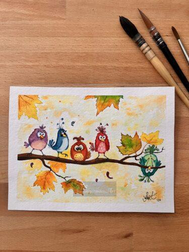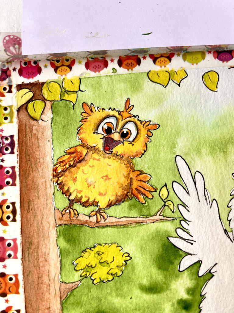 Ich hatte schonmal diese Schar bunter Vögel als Geburtstagskarte für einen Freund gemacht. Etwas in dieser Art würde für ein buntes fröhliches Kinderzimmer passen. Und dann habe ich mich rangewagt an das größere Bild mit den 3 Eulen.
