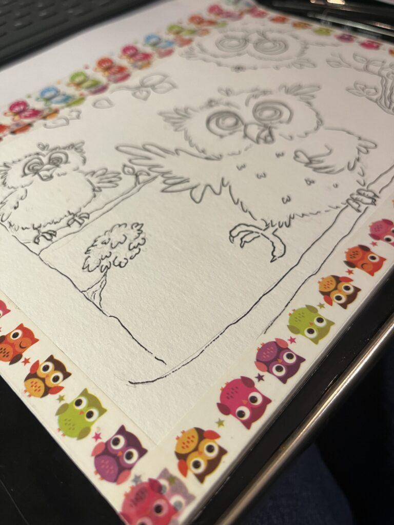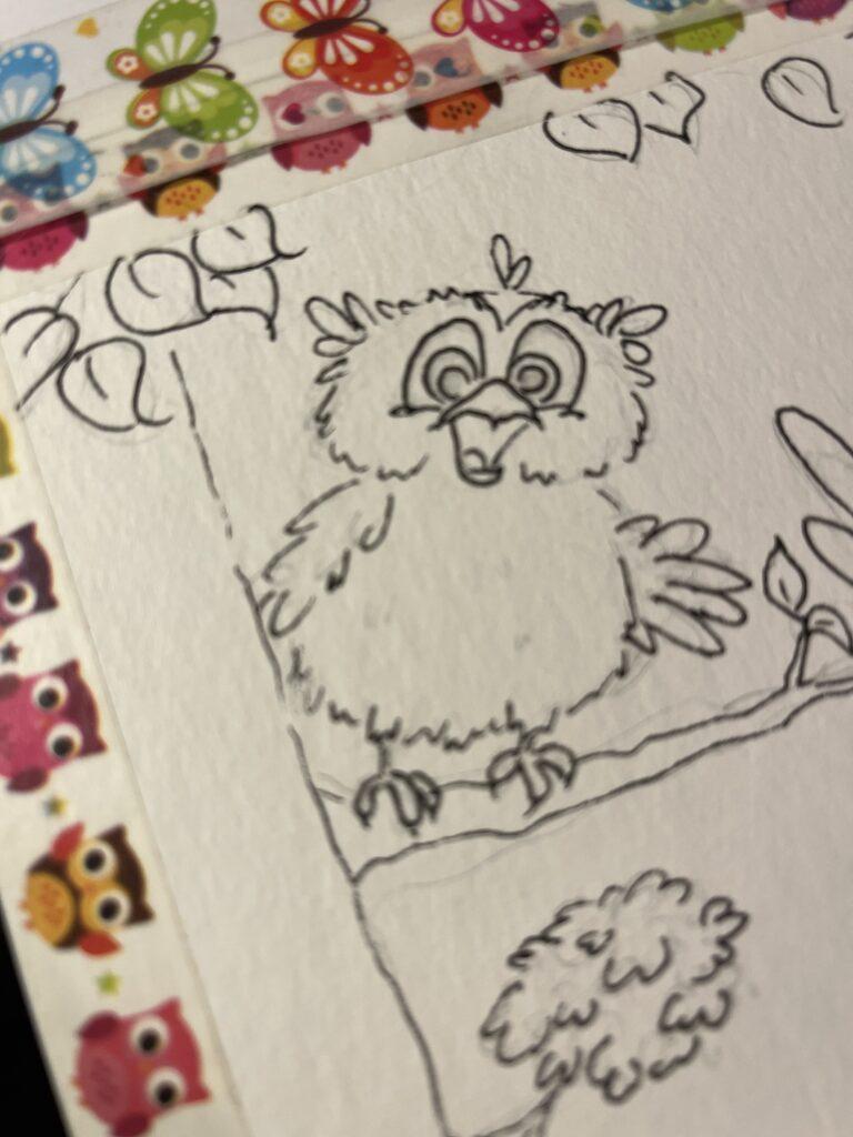 Zur Sicherheit habe ich deshalb erstmal ein Eulenübungsbild gezeichnet bevor ich mich an das gewünschte größere Format des Eulen-Auftrags gemacht habe.