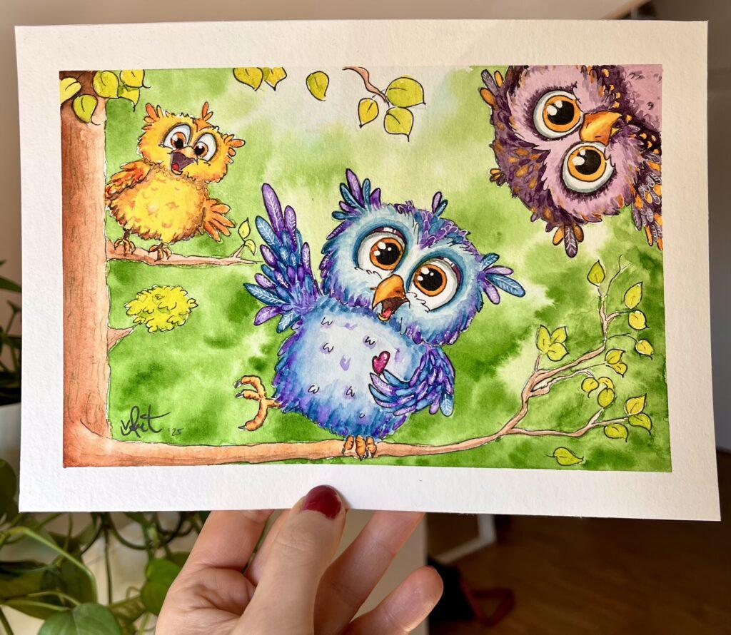 Ich freue mich so sehr, dass diese 3 verrückten Eulen jetzt in einem Kinderzimmer hängen und die fröhliche Vielfalt und bunte Kreativität seiner kleinen Bewohner*innen begleitet.