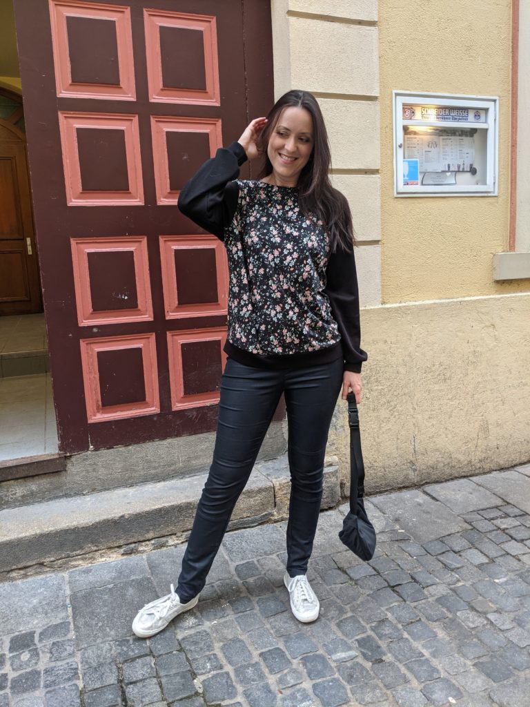 Vor einiger Zeit habe ich mir nur 1m dieses Blümchenjerseys gekauft und wusste damals schon dass ich ihn mit einem schwarzen Stoff zu einem Oberteil kombinieren würde. Dann habe ich den schwarzen Sweat gefunden, der nicht zu dick ist. Dadurch funktionieren diese beiden etwas unterschiedlich dicken Stoffe ganz gut miteinander.