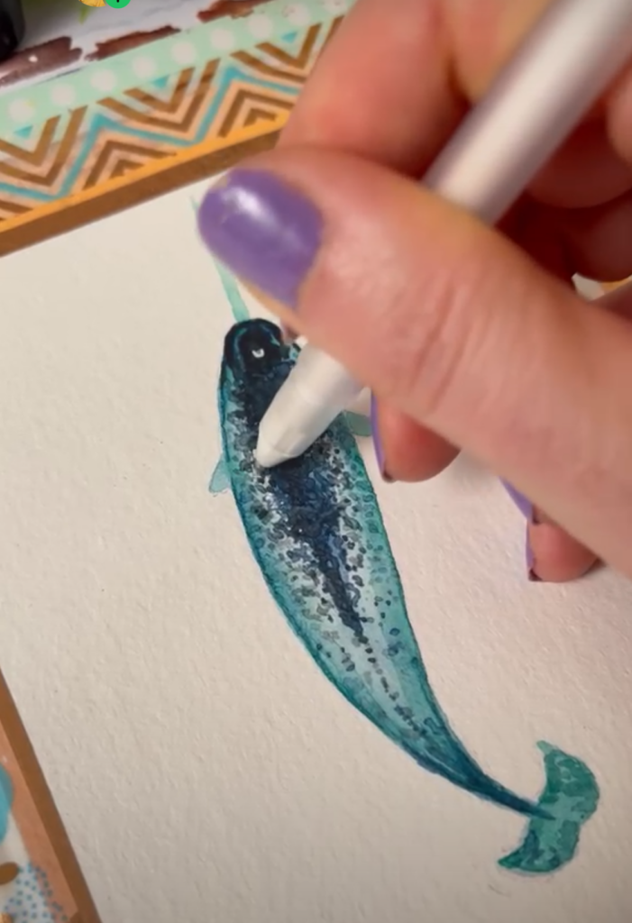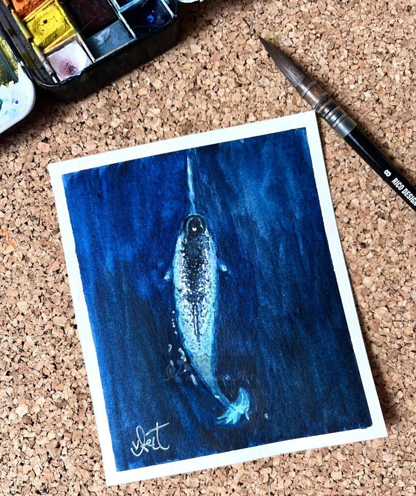 Auch wenn ich bei diesem Bild nicht so tief in die Farbenkiste greifen wollte, um dem Meer nicht seine kühle dunkle Tiefe zu nehmen, war es schön, das ganze Papier mit kräftig tiefem Blau und Türkis zu füllen. Und ich sage euch, es ist so beruhigend ganz viele Narwalvideos zu schauen!