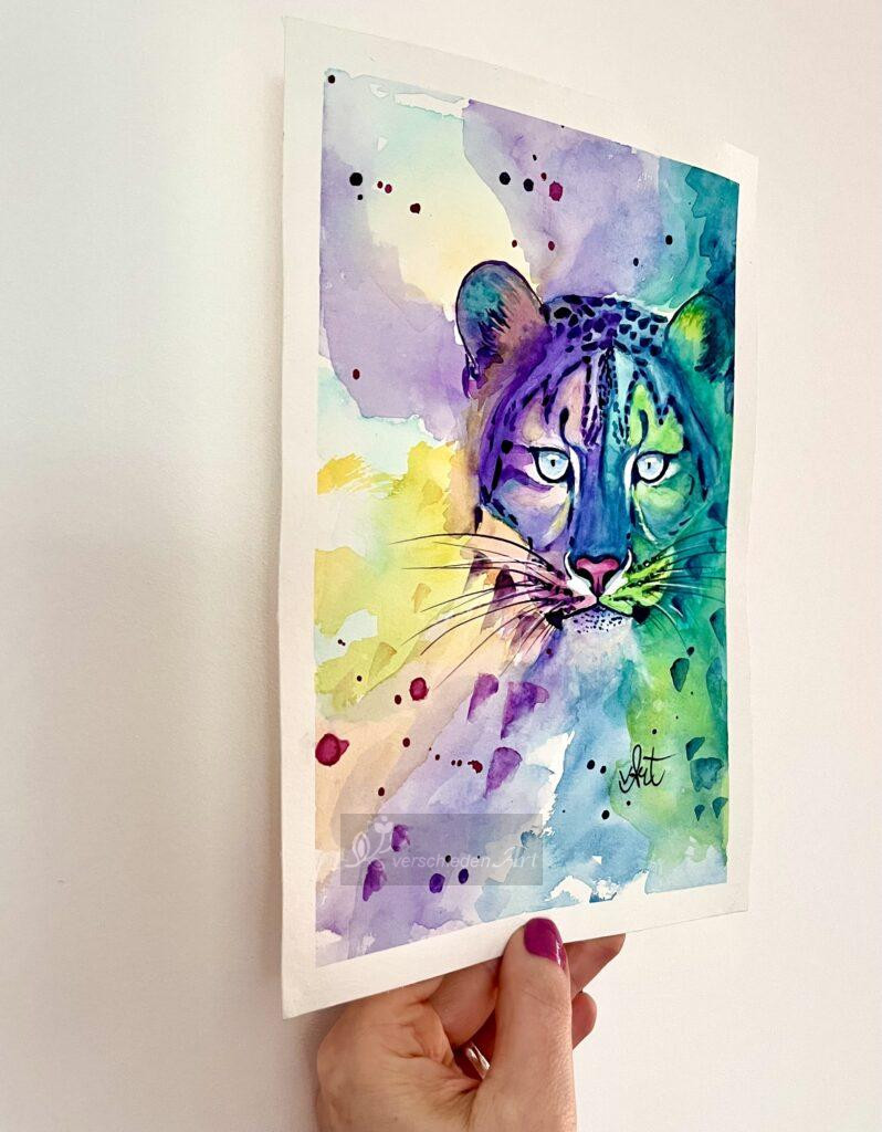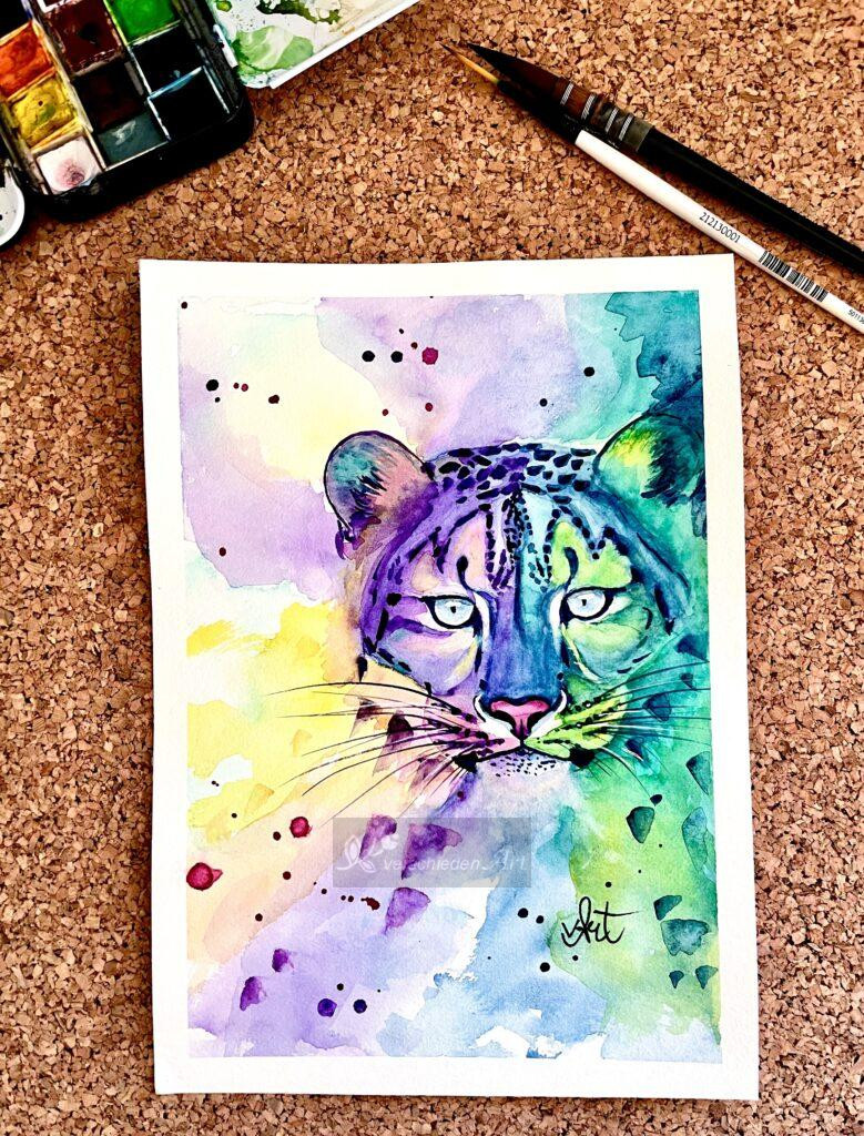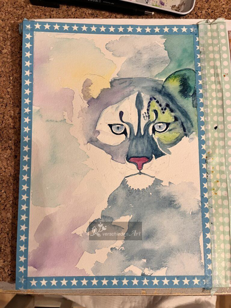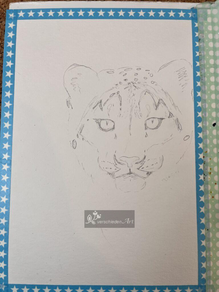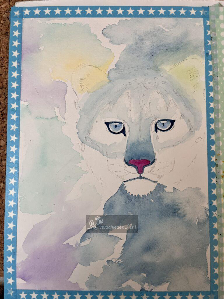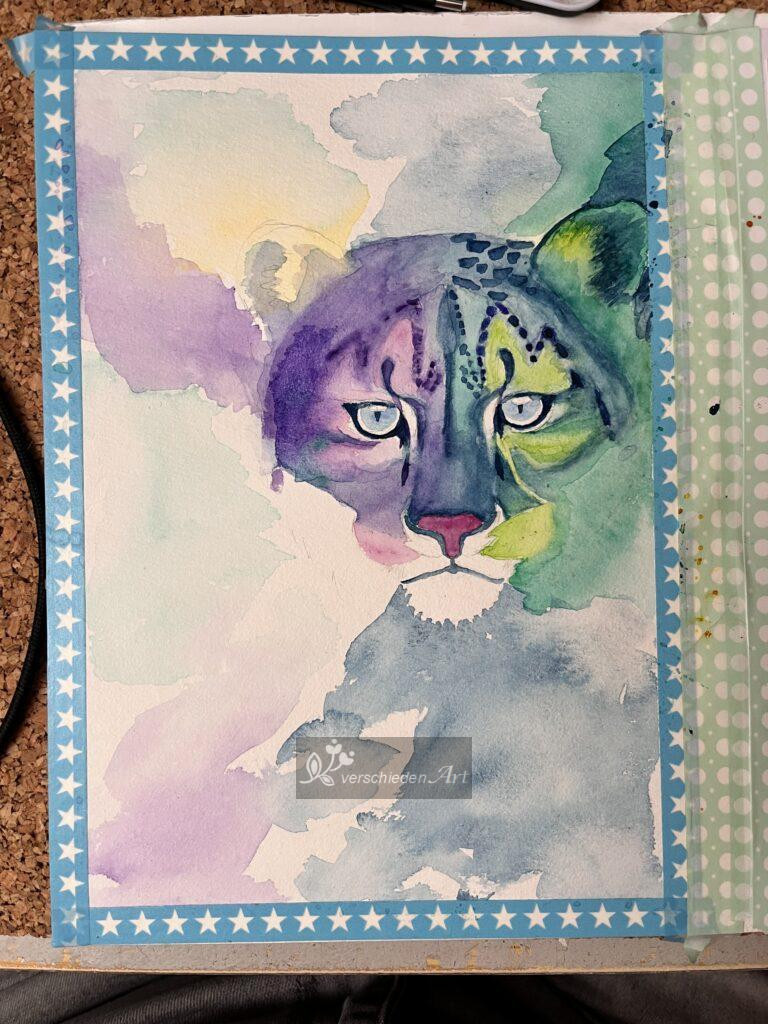 Die Farben habe ich mir lange überlegt und einige Zettel probebemalt bis mir die Kombination gefallen hat, denn ich wollte den Schneeleoparden bunt gestalten, und gleichzeitig sollte er kühl wirken – nach Schnee eben. Seine kühlen blauen Augen wollte ich dabei besonders betonen, da er so durchdringend blickt.