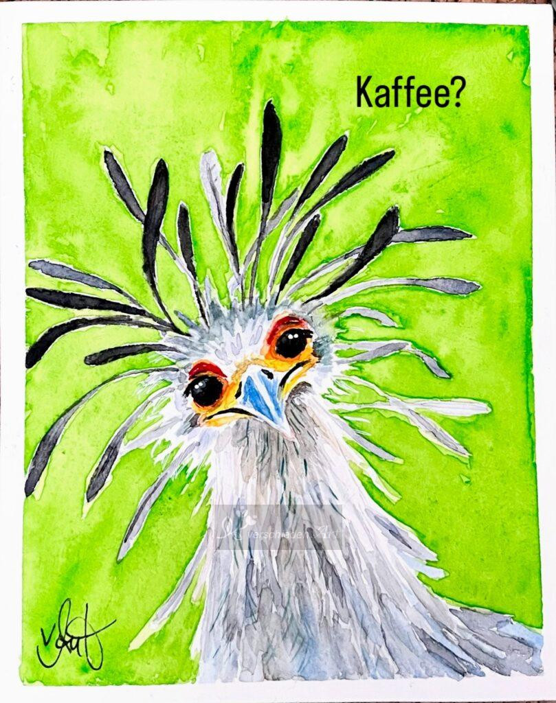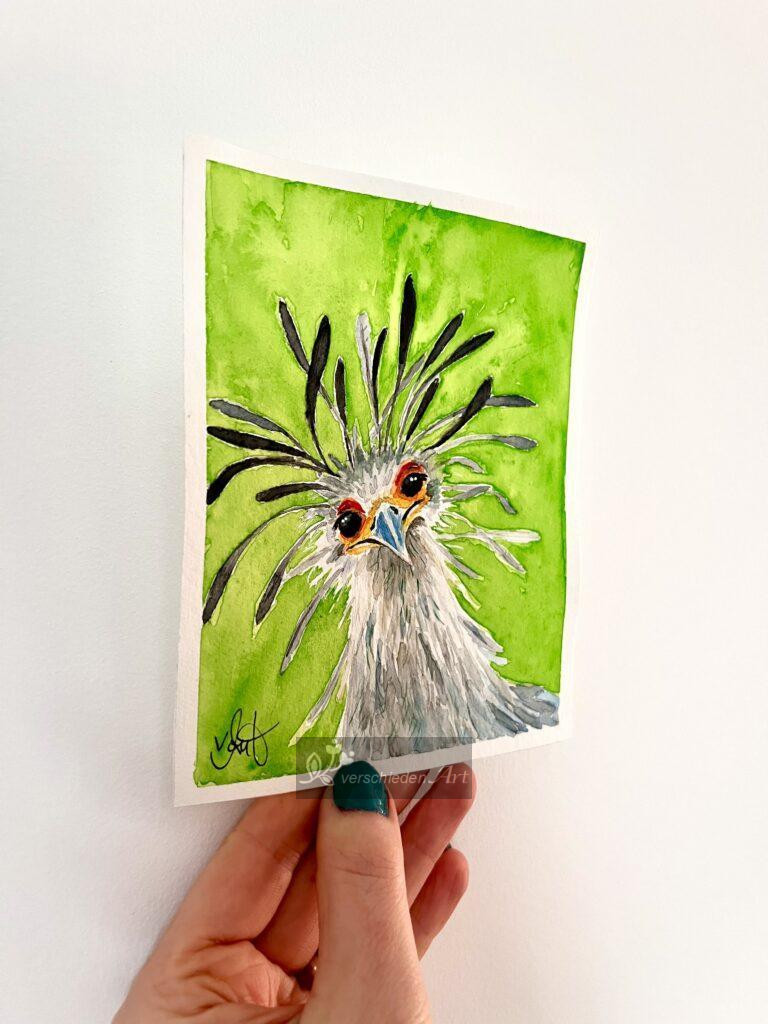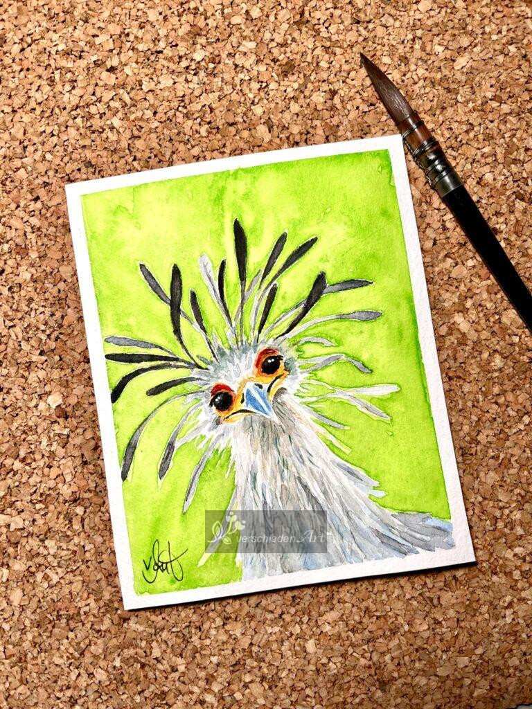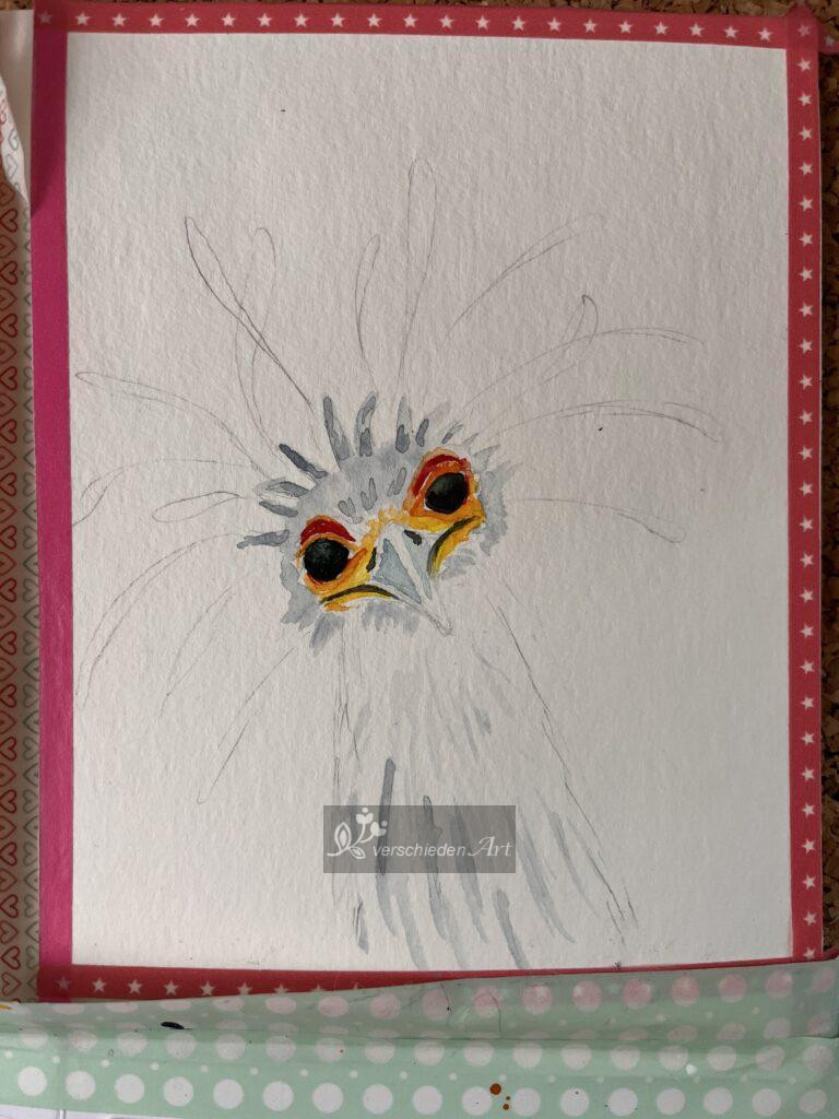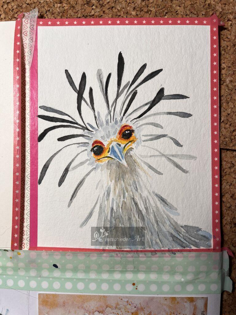 Beim nächsten Tier auf der Liste habe ich erst gezögert, ob ich es überhaupt malen mag, denn es ist ein Vogel: ein Sekretär. Bisher habe ich noch nicht so viele Vögel gezeichnet, sodass ich nicht so geübt darin bin. Ich glaube, die Eulen waren die ersten Federtiere, die ich gemalt habe. Aber man wächst ja mit seinen Herausforderungen, also habe ich es doch angepackt, diesen besonderen Vogel mit seinen lustig wippenden dunklen Federn am Kopf zu zeichnen.
