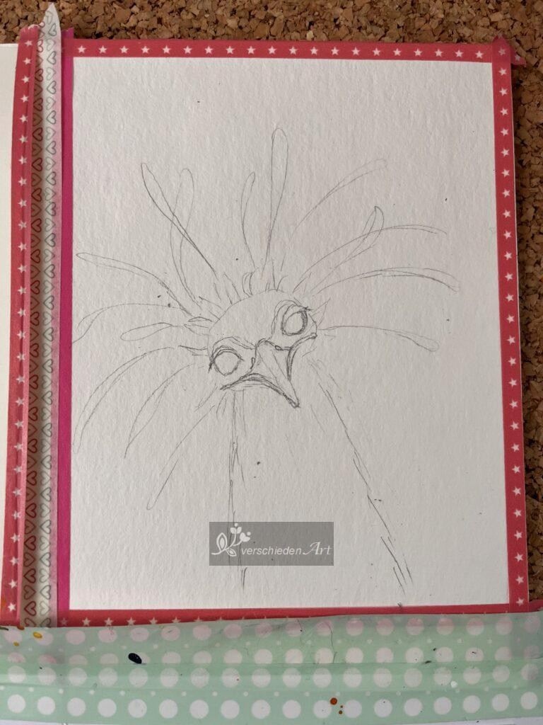 Die hellgrauen und weißen Federn bunt zu machen, habe ich mich nicht getraut. Dafür hat er einen knalligen saftig grünen Hintergrund bekommen.